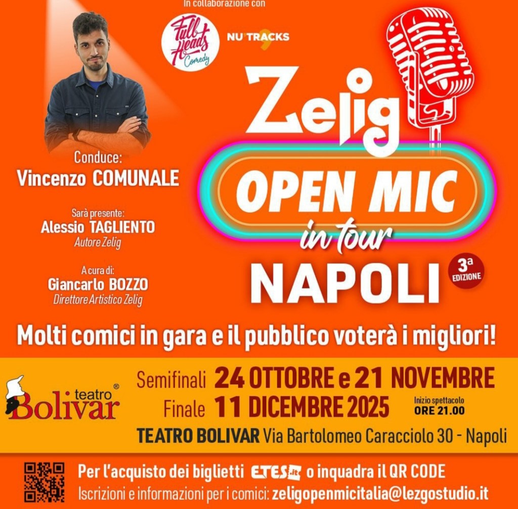 Venerdì 24 ottobre 2025, alle ore 21.00, al Teatro Bolivar (Via Bartolomeo Caracciolo, 30), diretto da Nu’Tracks, ritorna la prima delle tre serate di “Zelig Open Mic in tour”, in collaborazione con il direttore artistico di Zelig Giancarlo Bozzo, organizzato con Area Zelig e Full Heads Comedy econdotto da Vincenzo Comunale e Alessio Tagliento.