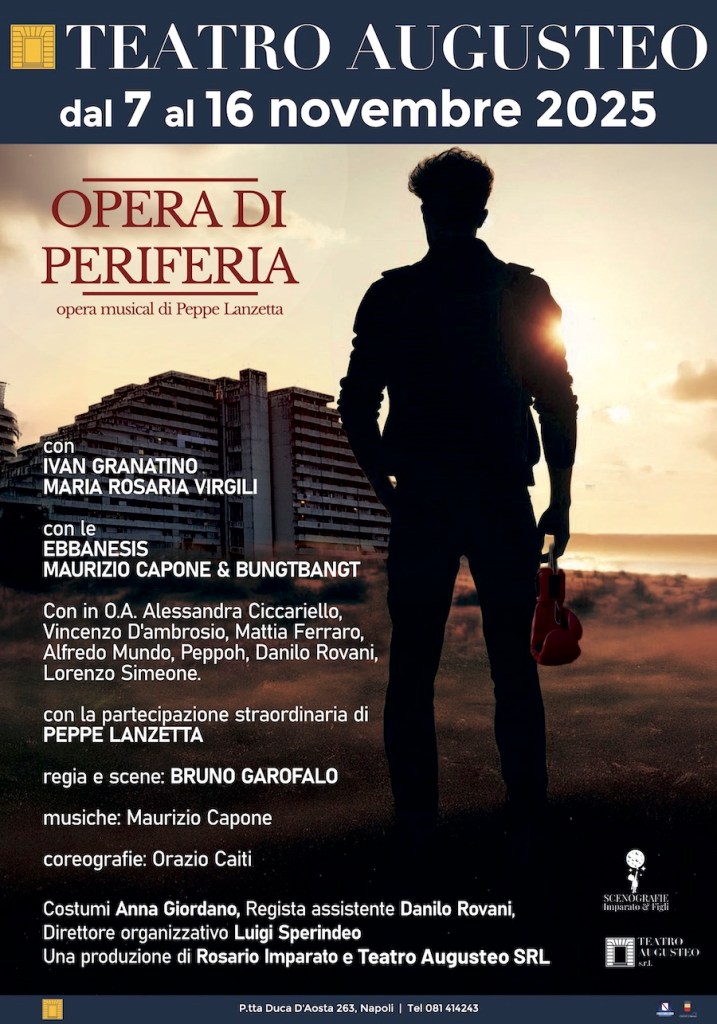 Al teatro Augusteo di Napoli, Piazzetta duca d’Aosta 263, da venerdì 7 a domenica 16 novembre 2025, sarà in scena “Opera di Periferia”, Opera musical di Peppe Lanzetta. Uno spettacolo dal grande impatto emozionale con protagonisti Ivan Granatino, Maria Rosaria Virgili, con le Ebbanesis, Maurizio Capone & Bungtbangt e ancora con in o.a. Alessandra Ciccariello, Vincenzo D’Ambrosio, Mattia Ferraro, Alfredo Mundo, Peppoh, Danilo Rovani, Lorenzo Simeone e la partecipazione straordinaria di Peppe Lanzetta. Regia e scene di Bruno Garofalo. Musiche di Maurizio Capone. Coreografie di Orazio Caiti. Costumi di Anna Giordano.