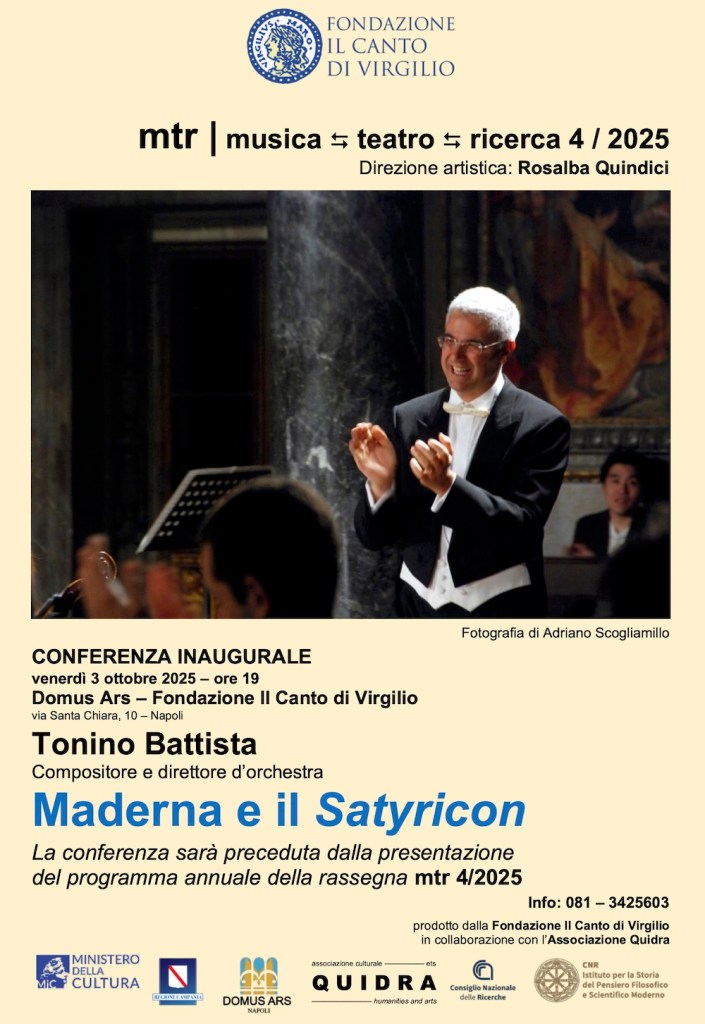 Francesco D’Orazio, “Il violino da Bach a Hosokawa“. Verranno eseguiti brani di Bach, Berio, Hosokawa, Saariaho, Sciarrino.MTR 2025 gode della collaborazione dell’Accademia di Belle Arti di Napoli, dell’Istituto per la Storia del Pensiero Filosofico e Scientifico Moderno del CNR e dell’Associazione Quidra. E’ prodotta con il contributo del Ministero della Cultura e della Regione Campania,