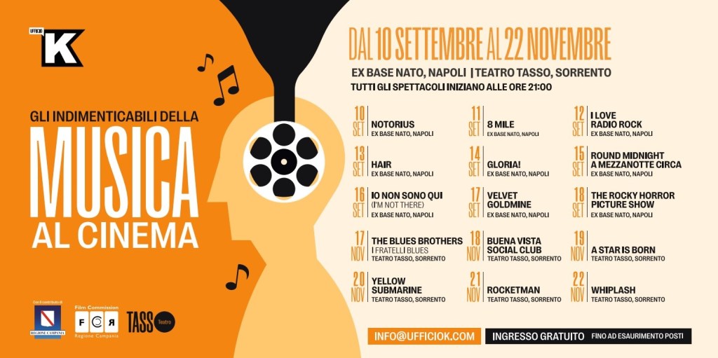 Tutte le proiezioni in programma sono ad ingresso gratuito fino ad esaurimento dei posti disponibili.Per info e contatti: Tel 081.17560779 – info@teatrotassosorrento.it – info@ufficiok.comUfficio stampa:Umberto Di Micco dmvcomunicazione@gmail.com