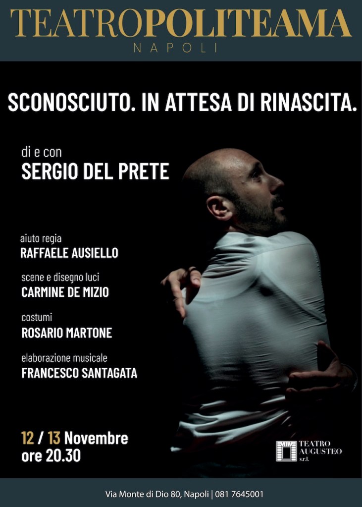 Mercoledì 12 e giovedì 13 novembre 2025 alle ore 20.30, al Politeama di Napoli in Via Monte di Dio 80, sarà in scena “Sconosciuto. In attesa di rinascita” di e con Sergio Del Prete, che firma anche la regia.