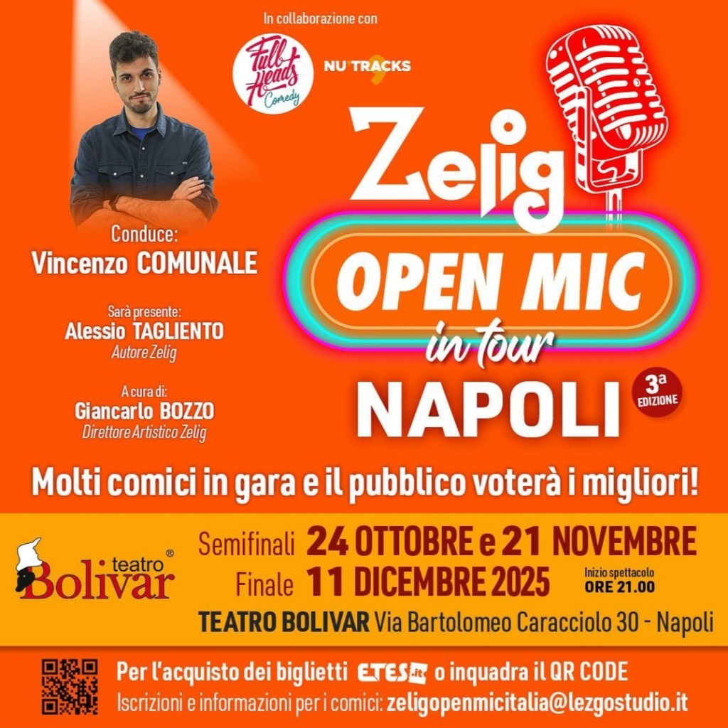 Venerdì 21 novembre 2025, alle ore 21.00, al Teatro Bolivar (Via Bartolomeo Caracciolo, 30), diretto da Nu’Tracks, arriva la seconda delle tre serate di “Zelig Open Mic in tour”, in collaborazione con il direttore artistico di Zelig Giancarlo Bozzo, organizzato con Area Zelig e Full Heads Comedy econdotto da Vincenzo Comunale e Alessio Tagliento. Il vero protagonista delle serate è il pubblico non solo perché decide quali comici votare alla fine delle esibizioni ma soprattutto perché Vincenzo Comunale ne fa il reale interlocutore della serata; al di là dei comici, infatti, succedonocose non previste e sempre divertenti.