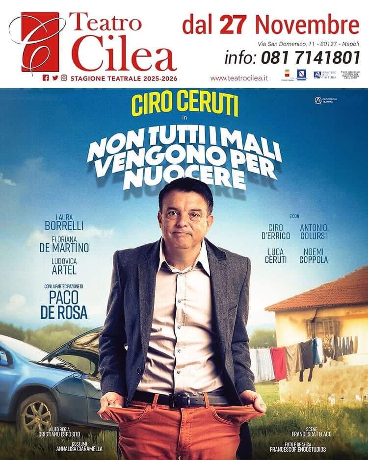 TEATRO CILEA DI NAPOLI: DAL 27 AL 30 NOVEMBRE IL NUOVO SPETTACOLO di CIRO CERUTI”NON TUTTI I MALI VENGONO PER NUOCERE”, UNA COMMEDIA SULL’ITALIA DEGLI ULTIMI VENT’ANNI.