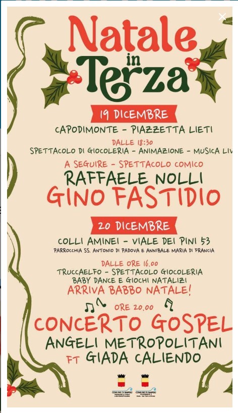 “NATALE IN TERZA 2025” A NAPOLI TRA I COLLI AMINEI E CAPODIMONTE UN VIAGGIO DI LUCE, RISATE E MUSICA con il punk cabaret di GINO FASTIDIO, la stand up comedy di RAFFAELE NOLLI e il gruppo gospel ANGELI METROPOLITANI con GIADA CALIENDO