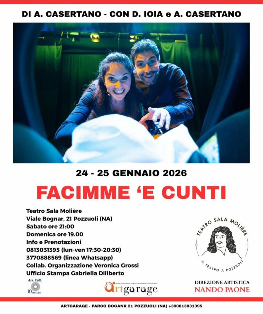 Sabato 24 (ore 21.00) e domenica 25 gennaio 2026 (ore19.00), al Teatro Sala Molière di Pozzuoli (Via Bognar, 21), diretto da Nando Paone, andrà in scena “Facimme ‘e Cunti” di Antimo Casertano, con Daniela Ioia e Antimo Casertano, tratto da “Lu Cunto de li Cunti” di Giambattista Basile.