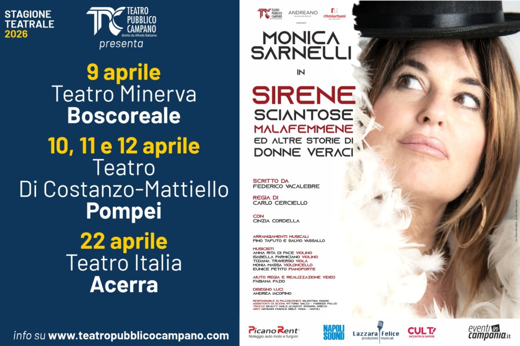 Il Teatro Pubblico Campano, diretto da Alfredo Balsamo porta in tour “Sirene, sciantose, malafemmene ed altre storie di donne veraci”, spettacolo che vede protagonista Monica Sarnelli, scritto da Federico Vacalebre con la regia di Carlo Cerciello. Lo spettacolo, in un’edizione completamente rinnovata, è prodotto da RitmiUrbani Network, Lazzara Felice, Andreano Management.